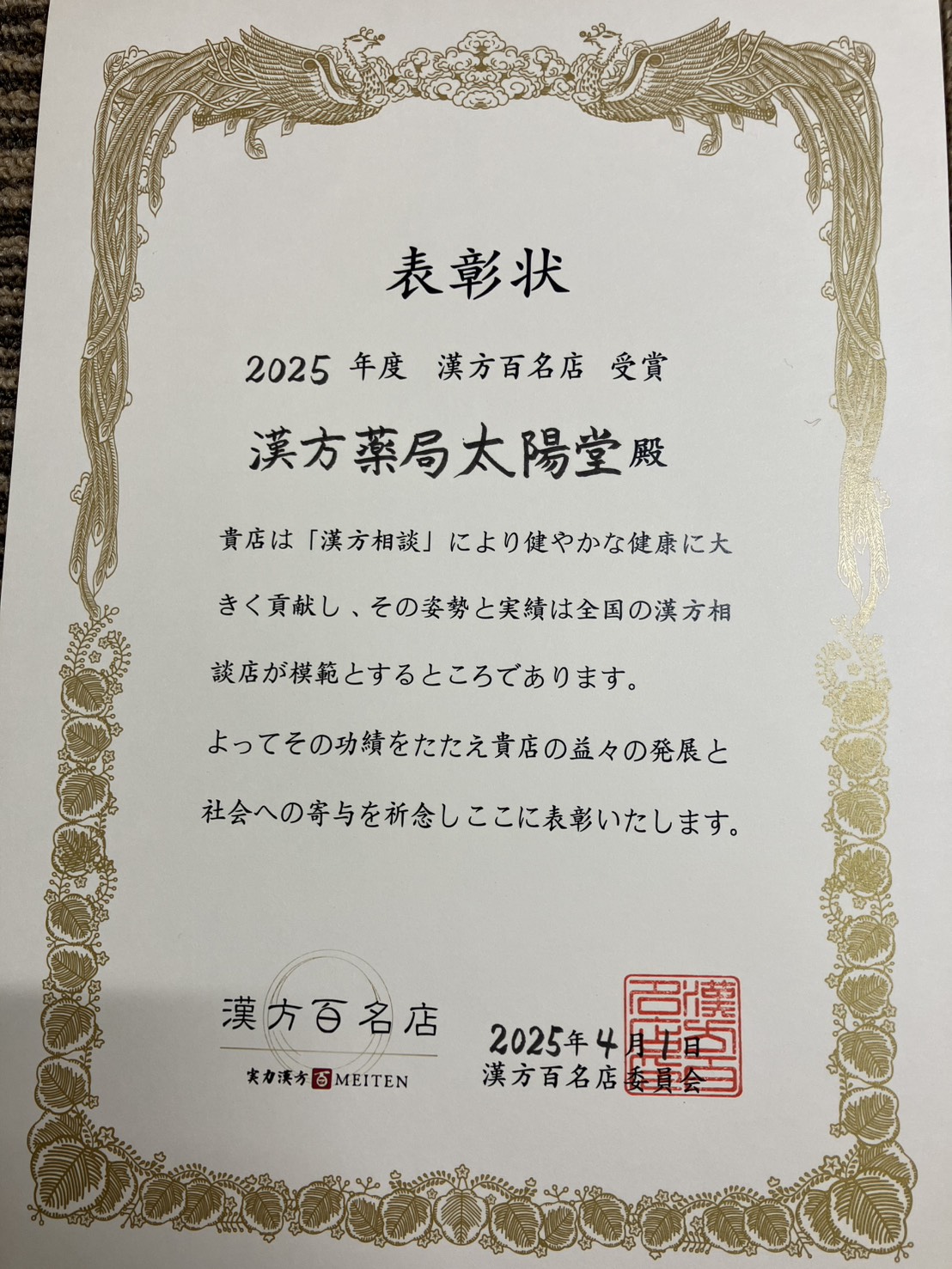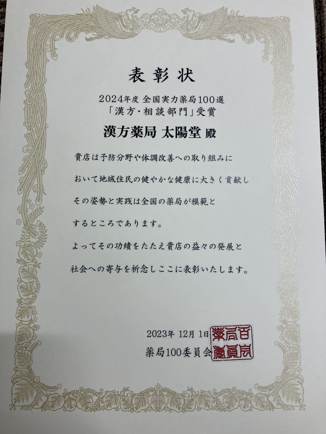太陽堂は全国実力100選・漢方百名店に選ばれております。