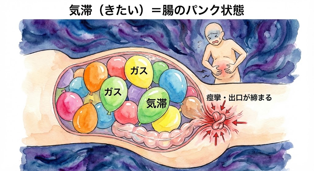 漢方における「気滞(きたい)」によるお腹の張りのメカニズム図解。腸の中にパンパンに膨らんだ風船(ガス)が充満し、ストレスによる痙攣で出口が締まって排出できない様子を描いたイラスト。過敏性腸症候群のガスだまりのイメージ図。