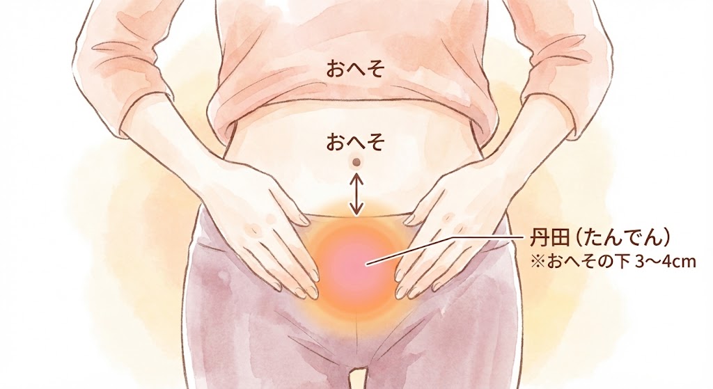過敏性腸症候群(IBS)やガス腹の改善に効果的なツボ「丹田(たんでん)」の位置を示した図解イラスト。おへその下3〜4cm(指3本分下)の部分がじんわり温まっている様子。ここをカイロや腹巻で温めることで腸の緊張を和らげるセルフケアのイメージ図。