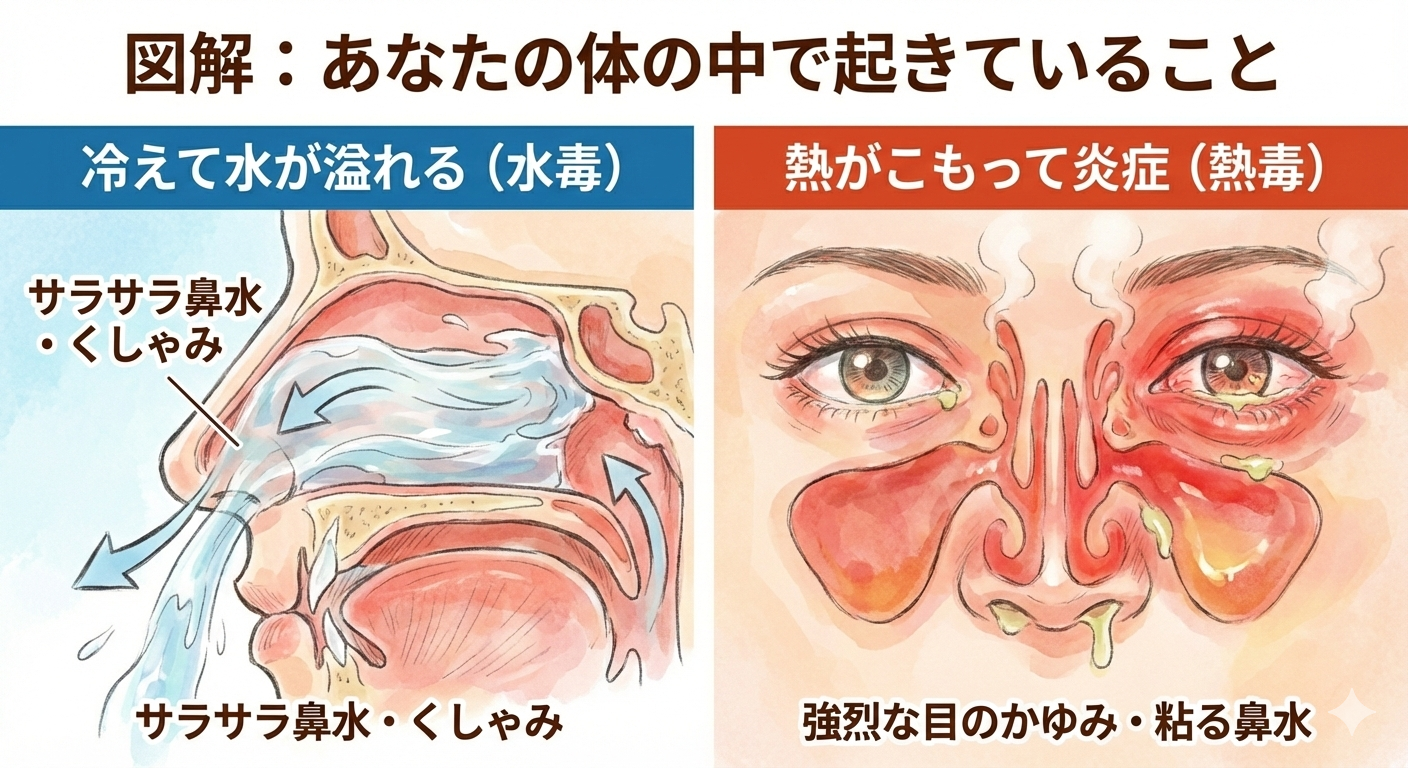 花粉症の体内メカニズムを解説する図解イラスト。左側は「冷えて水が溢れる(水毒)」状態で、鼻の断面図からサラサラした鼻水が流れ出ている様子。右側は「熱がこもって炎症(熱毒)」状態で、目と鼻の粘膜が赤く腫れ上がり、熱気が出ている様子を描写。