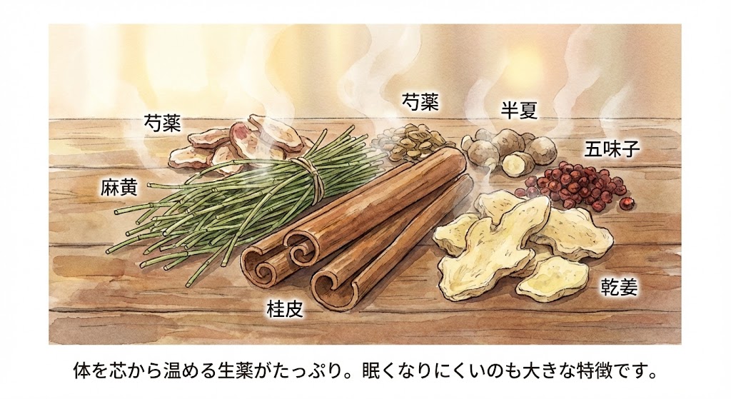 - 乾姜(カンキョウ)、細辛(サイシン):お腹や芯を温め、寒さを取り除く。