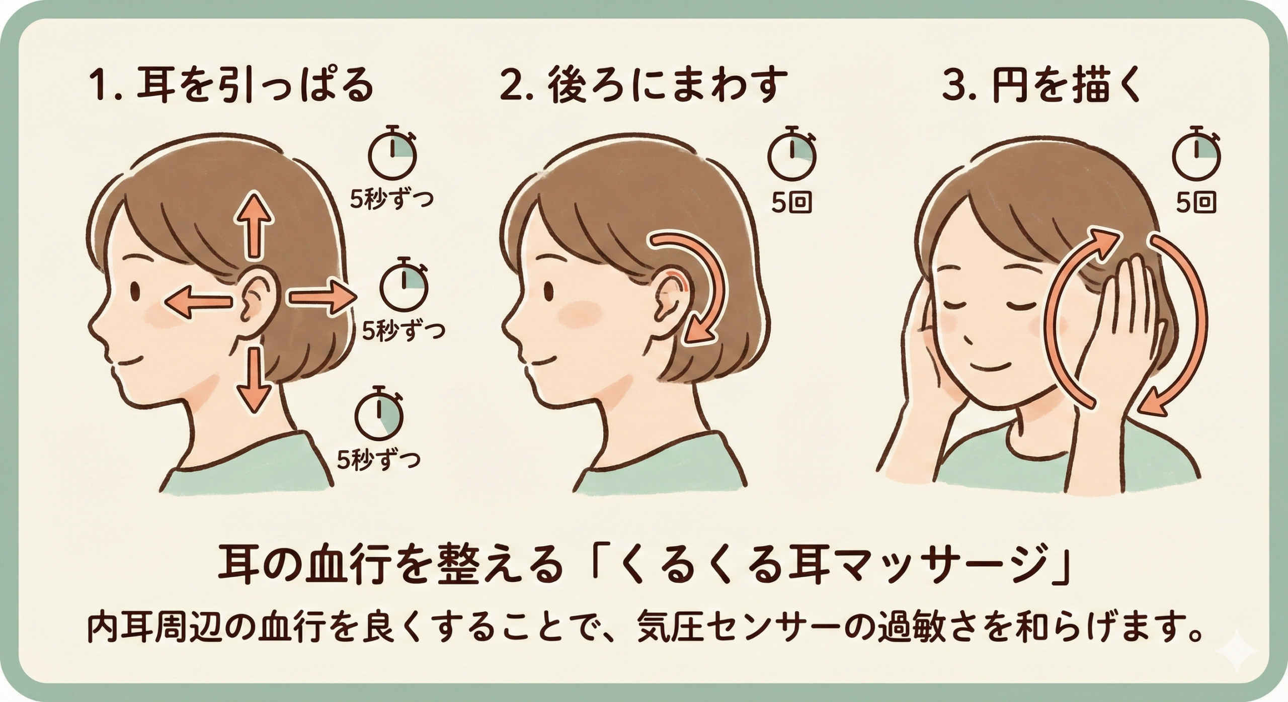 耳の血行を整える「くるくる耳マッサージ」のイラスト図解。1.耳を上下横に5秒ずつ引っ張る、2.後ろに5回まわす、3.手のひらで覆って5回円を描くという3つの手順を示し、内耳の血行を良くして気圧センサーの過敏さを和らげる効果を説明している。