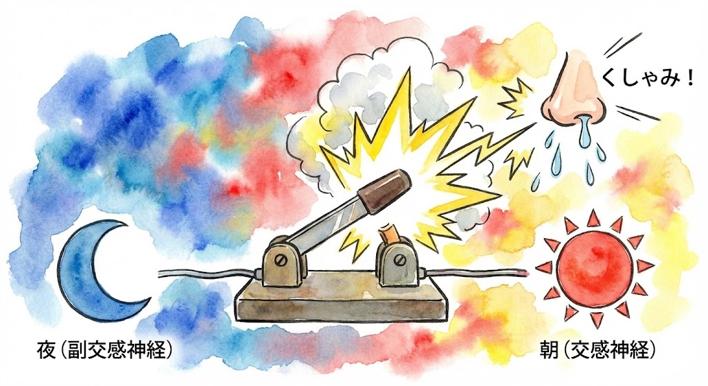 この切り替えの瞬間、バランスが乱れて一時的に「過敏状態」になり、少しの刺激(ホコリや冷気)でも猛烈なくしゃみ指令を出してしまうのです。