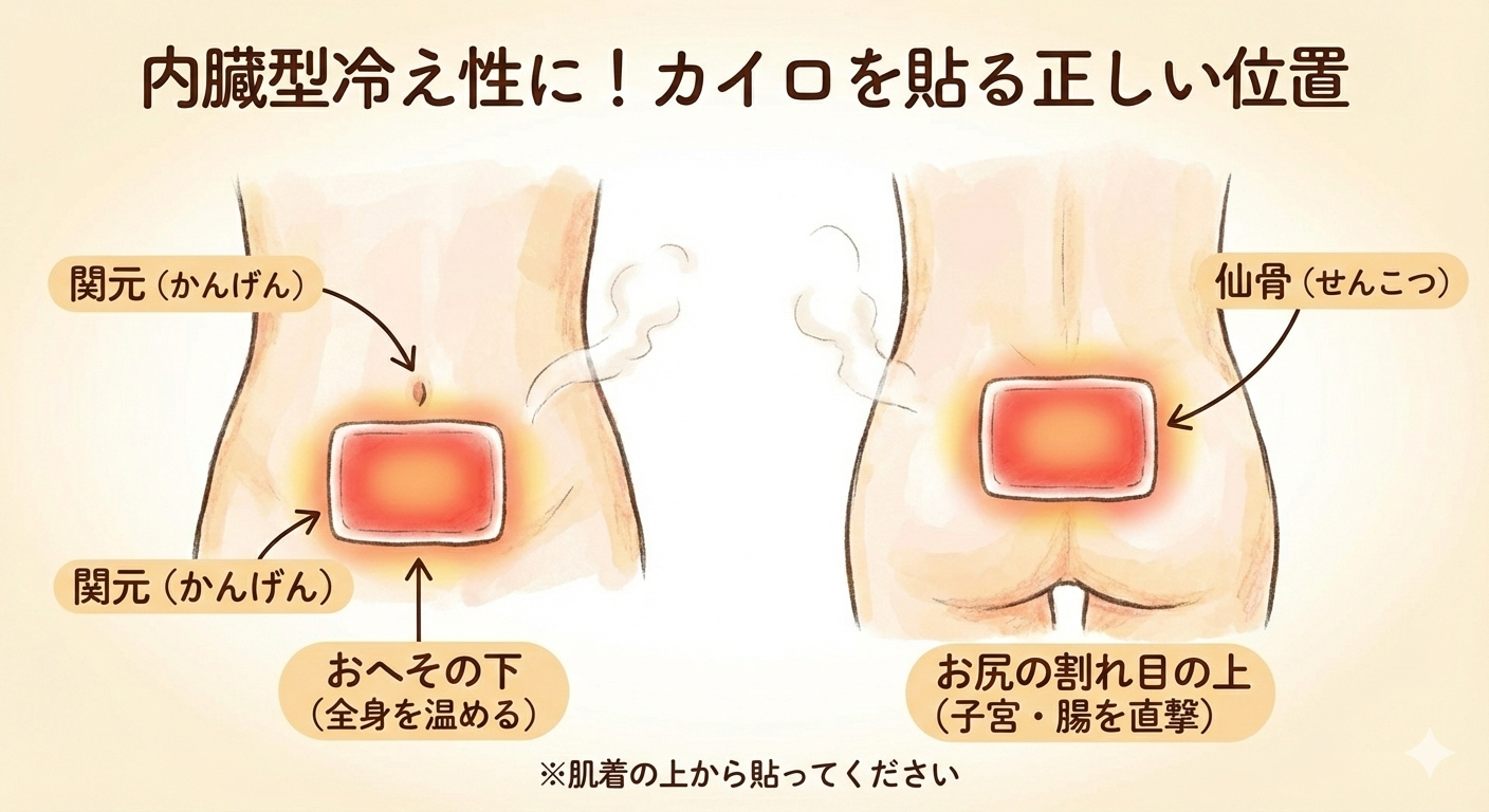 低下してしまった内臓温度を上げるには、物理的に温めるのが近道です。カイロを貼るなら、漫然と背中に貼るのではなく「効率よく熱が伝わるツボ」を狙いましょう。