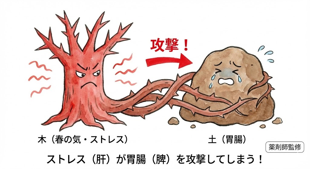 春はのびのびと成長する「木(もく)」のエネルギーを持つ季節ですが、ストレスでこの「木」が縮こまると、うっぷんを晴らすかのように「土(胃腸)」を根っこで攻撃してしまうんです。